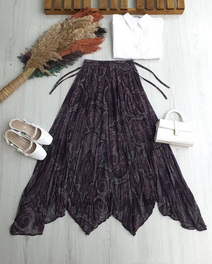 AGYEL ASİMETRİK KESİM YANLARI İPLİ DESENLİ ASTARLI ŞİFON ETEK B1-2-6100-18-MÜRDÜM
