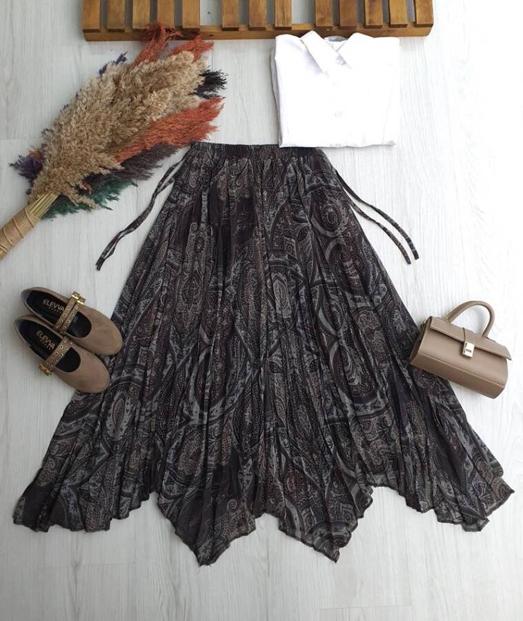 AGYEL ASİMETRİK KESİM YANLARI İPLİ DESENLİ ASTARLI ŞİFON ETEK A4-1- 6100-37-KAHVE