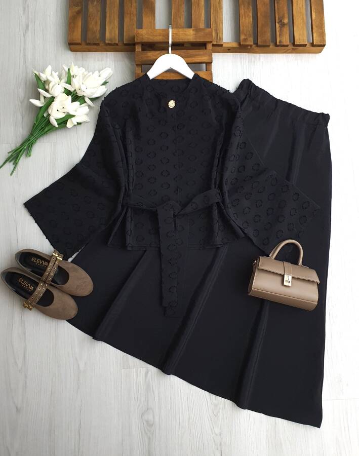 AKDN TEK DÜĞME BELİ ÖNÜ AÇIK KEMERLİ ETEKLİ TAKIM B3-2-1723-01-SİYAH