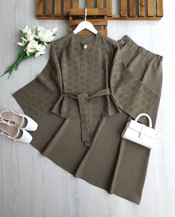 AKDN TEK DÜĞME BELİ ÖNÜ AÇIK KEMERLİ ETEKLİ TAKIM 1723-09-HAKİ