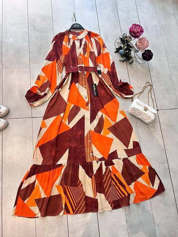 ALEH KEMERLİ DESENLİ ÖNÜ DÜĞMELİ ELBİSE D5-2306-06-KİREMİT
