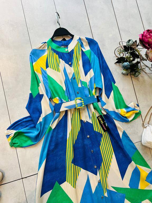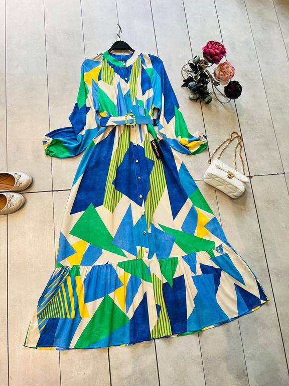 ALEH KEMERLİ DESENLİ ÖNÜ DÜĞMELİ ELBİSE D5-2306-14-SAKS