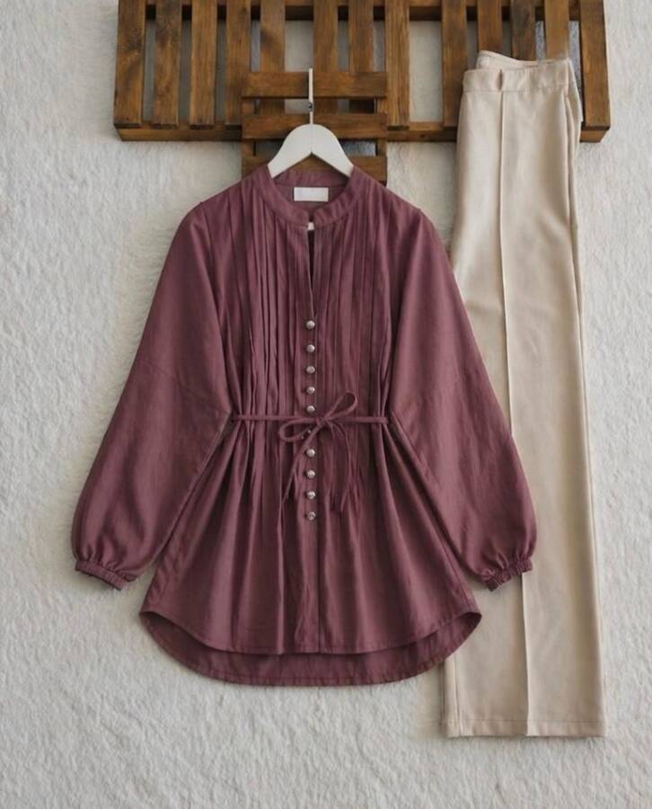 EWYİ KOL VE ÖN BAĞICIK DETAYLI GÖMLEK 5724-18-MÜRDÜM
