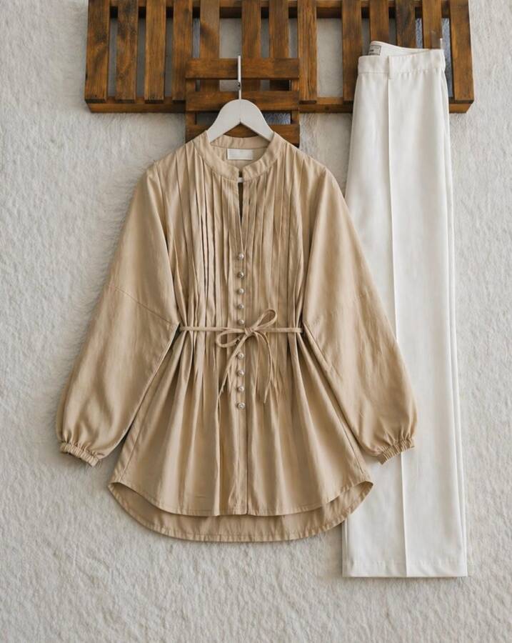 AUDE BRİT DÜĞME NERVÜR DİKİŞ SALAŞ GÖMLEK TUNİK 5725-34-BEJ