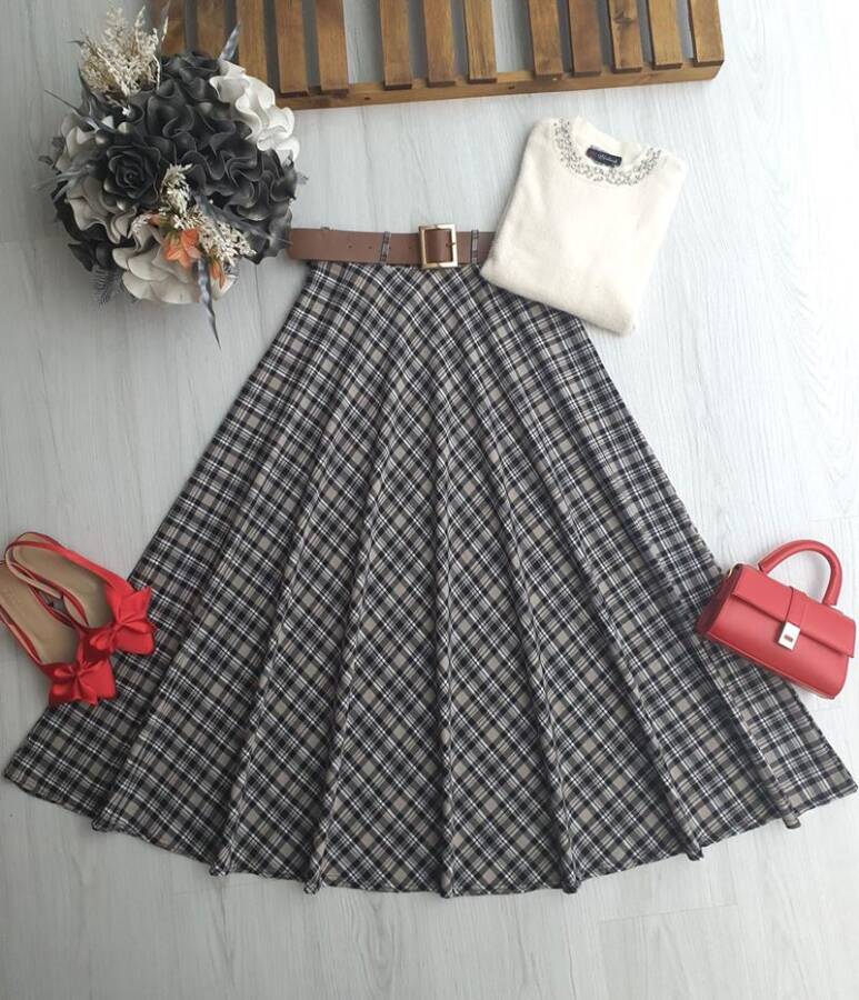 AZAW ÇİZGİLİ EKOSE DESEN DERİ KEMERLİ YANDAN FERMUARLI KİLOŞ ETEK B3-4-6096-34-BEJ