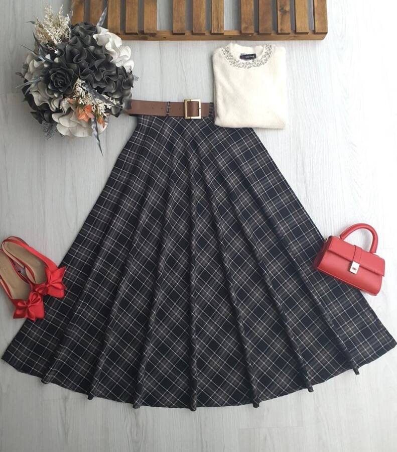 AZAW ÇİZGİLİ EKOSE DESEN DERİ KEMERLİ YANDAN FERMUARLI KİLOŞ ETEK B3-4-6096-98-KOYU KAHVE