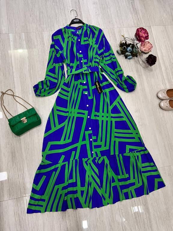 BERA KEMERLİ DESENLİ ÖNÜ DÜĞMELİ ELBİSE A9-4-2308-07-YEŞİL