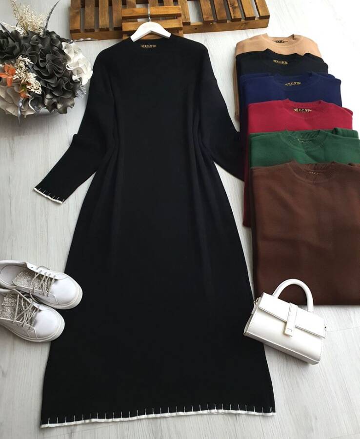 BİDED KOL VE ETEK UCU BEYAZ DOKUMA TRİKO ELBİSE 8141-01-SİYAH