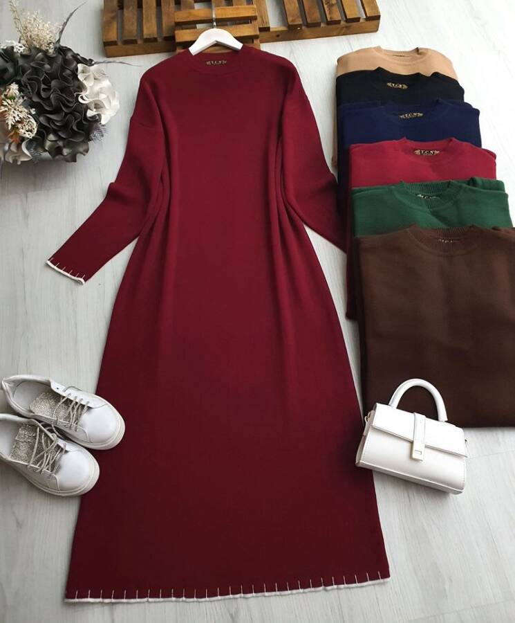 BİDED KOL VE ETEK UCU BEYAZ DOKUMA TRİKO ELBİSE 8141-04-BORDO