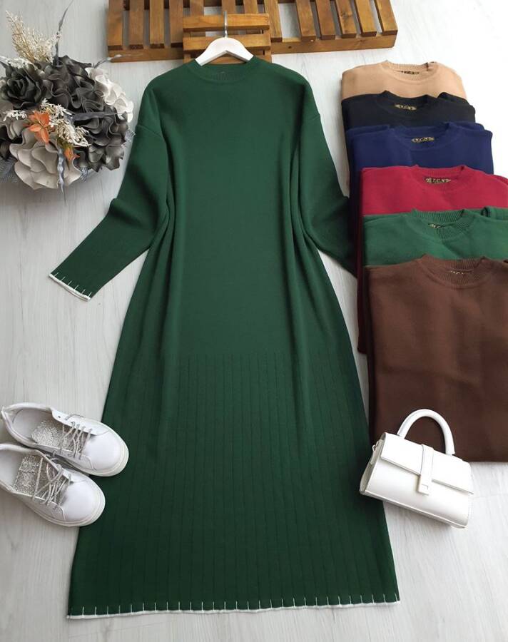 BİDED KOL VE ETEK UCU BEYAZ DOKUMA TRİKO ELBİSE 8141-27-ZÜMRÜT
