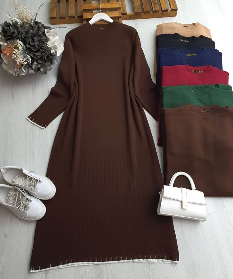 BİDED KOL VE ETEK UCU BEYAZ DOKUMA TRİKO ELBİSE 8141-37-KAHVE