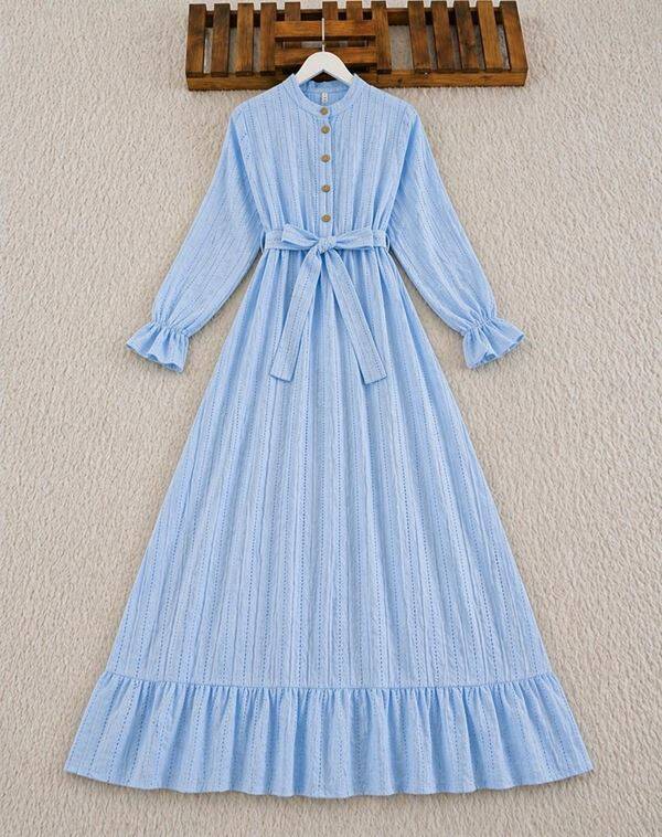 BİGN YARIM DÜĞMELİ BELİ LASTİKLİ KEMERLİ ASTARLI ELBİSE B8-4-2426-10-MAVİ