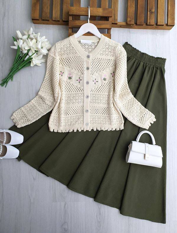 BOLSN ÇİÇEK NAKIŞLI AJURLU DOKUMA HIRKA 8206-34-BEJ