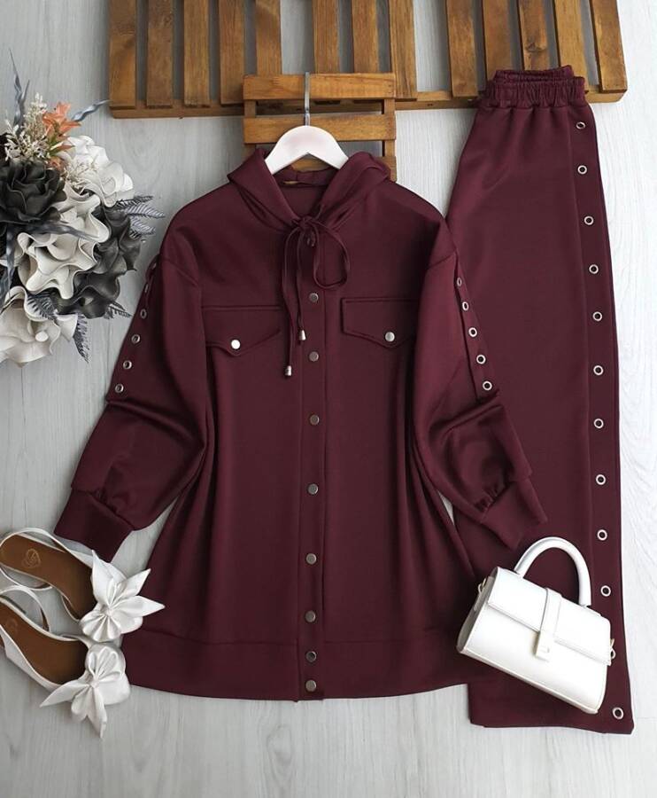 BUHEN KUŞGÖZÜ ŞERİTLİ ÇIT ÇIT DÜĞMELİ İKİLİ TAKIM A4-2-1686-04-BORDO