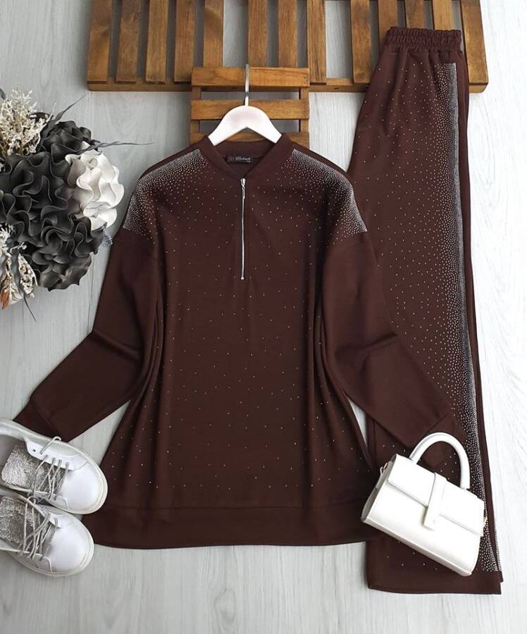 BUNA TAŞLI YARIM FERMUARLI İKİLİ TAKIM B2-2-1658-37-KAHVE
