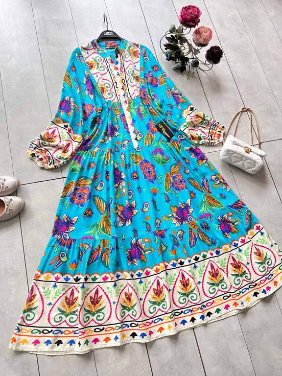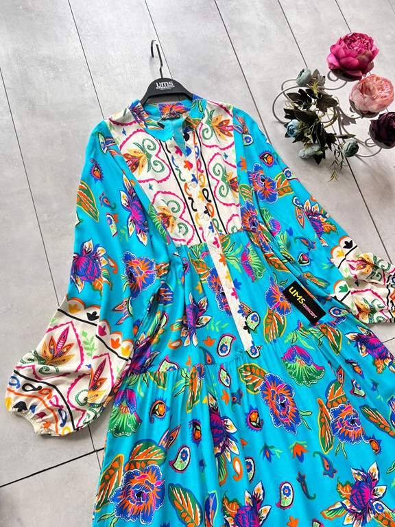 ÇAĞLA DESENLİ PATLI YARIM DÜĞMELİ SALAŞ ELBİSE D4-2300-59-TURKUAZ