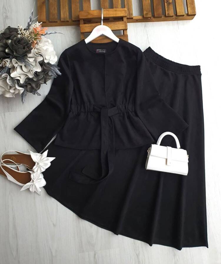 CUGE TEK DÜĞME YANLARI LASTİKLİ ÖNÜ BAĞLAMALI SÜET ETEKLİ TAKIM 1680-01-SİYAH