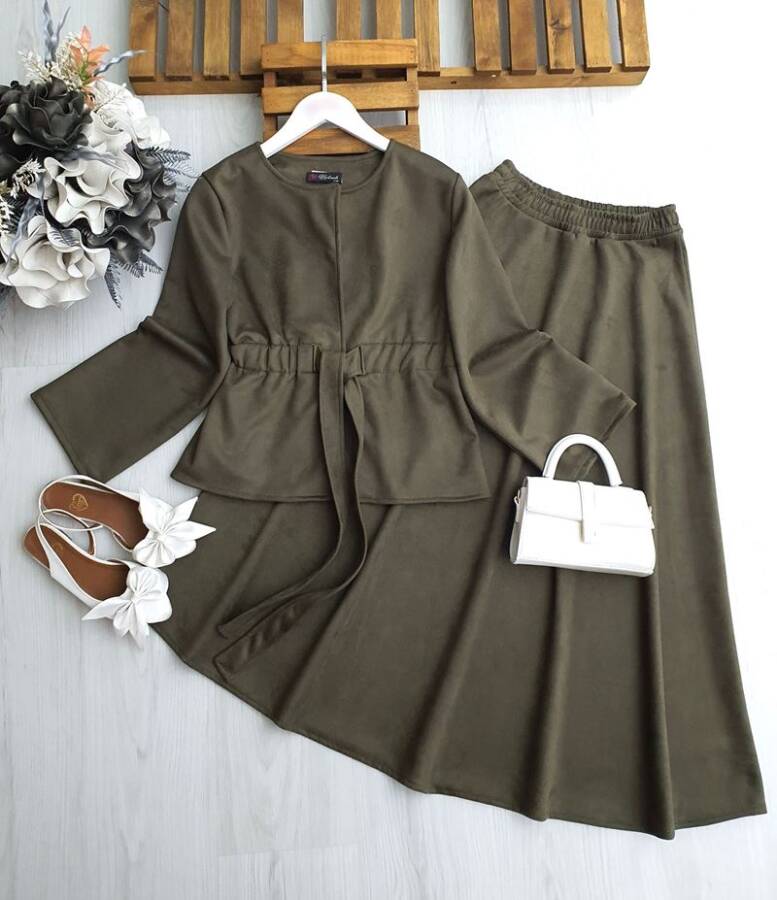 CUGE TEK DÜĞME YANLARI LASTİKLİ ÖNÜ BAĞLAMALI SÜET ETEKLİ TAKIM 1680-09-HAKİ