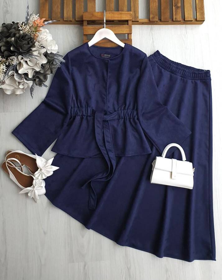 CUGE TEK DÜĞME YANLARI LASTİKLİ ÖNÜ BAĞLAMALI SÜET ETEKLİ TAKIM 1680-12-LACİVERT