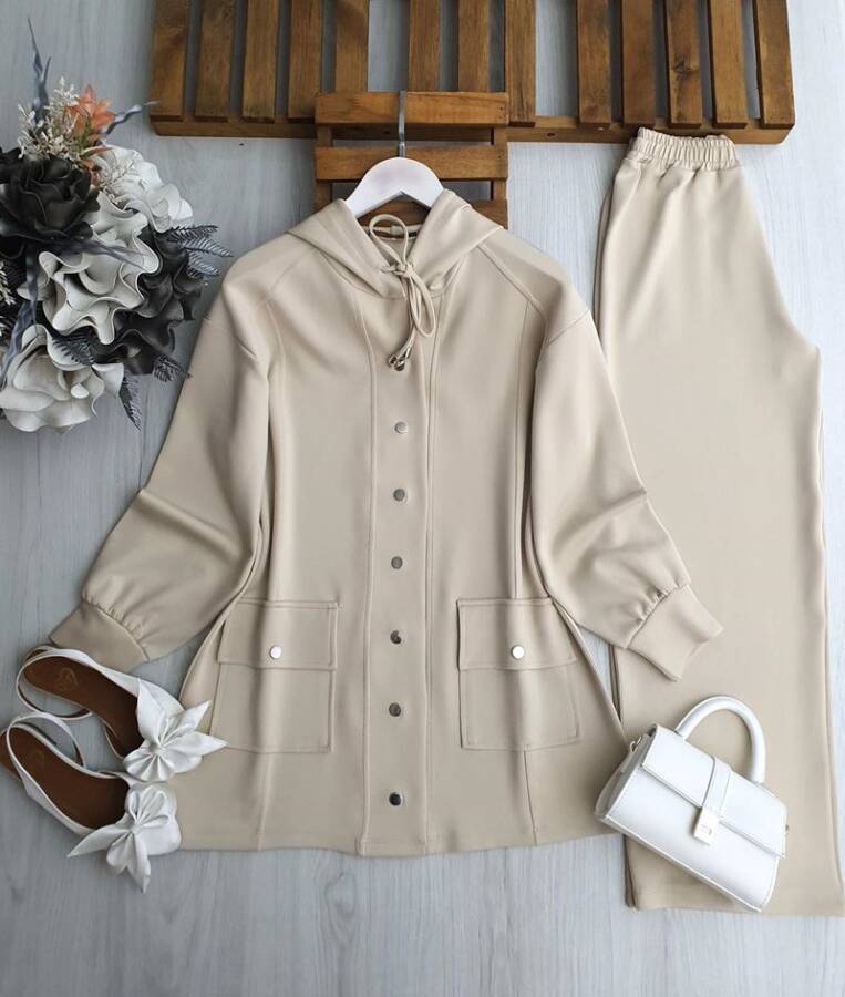 CUME ÇIT ÇIT DÜĞMELİ KAPŞONLU İKİLİ TAKIM A7-4-1685-34-BEJ