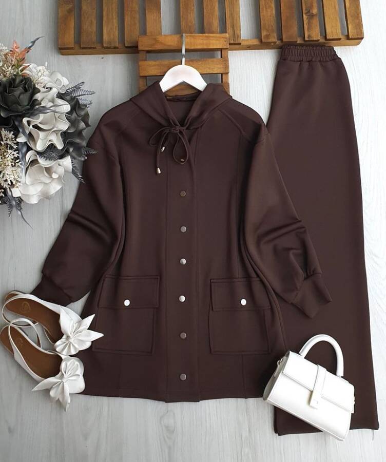 CUME ÇIT ÇIT DÜĞMELİ KAPŞONLU İKİLİ TAKIM A7-4-1685-37-KAHVE