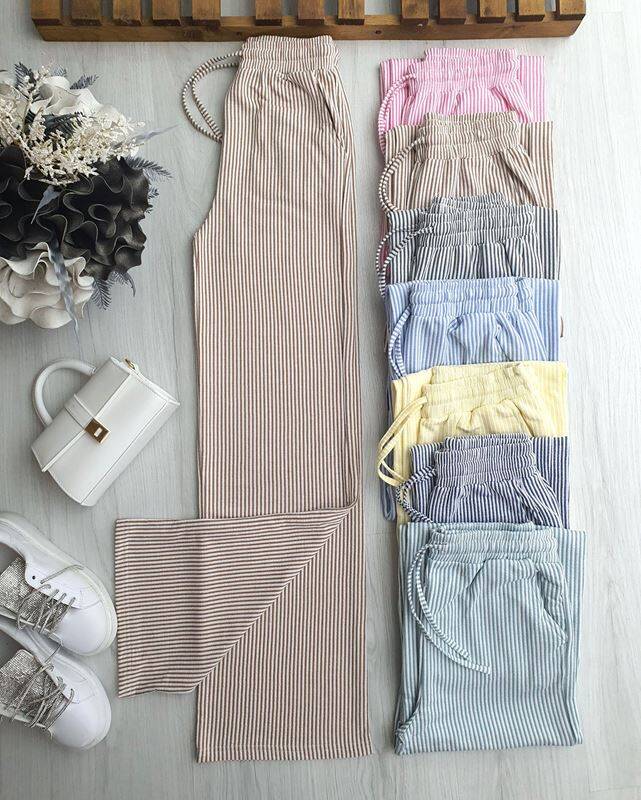 CUSAL BELİ LASTİKLİ BAĞCIKLI ÇİZGİLİ BOL PAÇA PANTOLON C9-6071-48-BİSKÜVİ