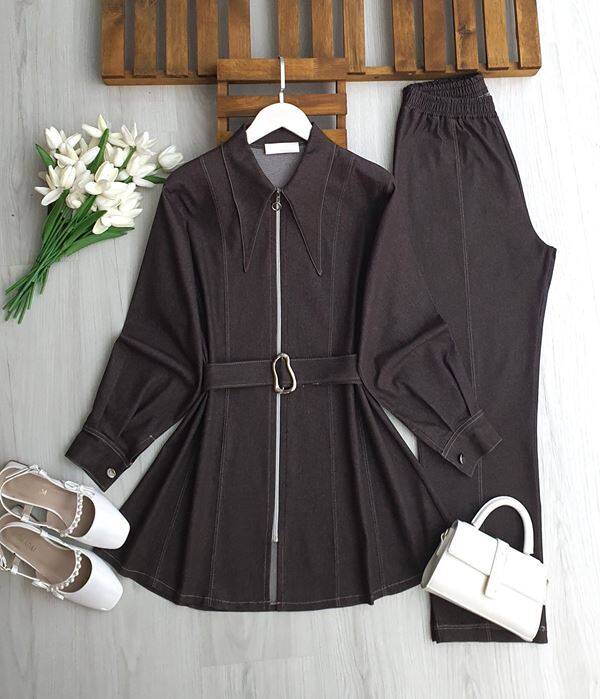 DARL SİVRİ YAKA TOKA KEMERLİ FERMUARLI KOT TAKIM 1736-37-KAHVE