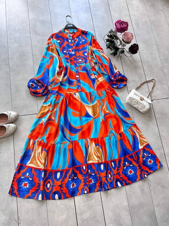 DEFNE DESENLİ PATLI YARIM DÜĞMELİ SALAŞ ELBİSE D4-2301-15-ORANJ
