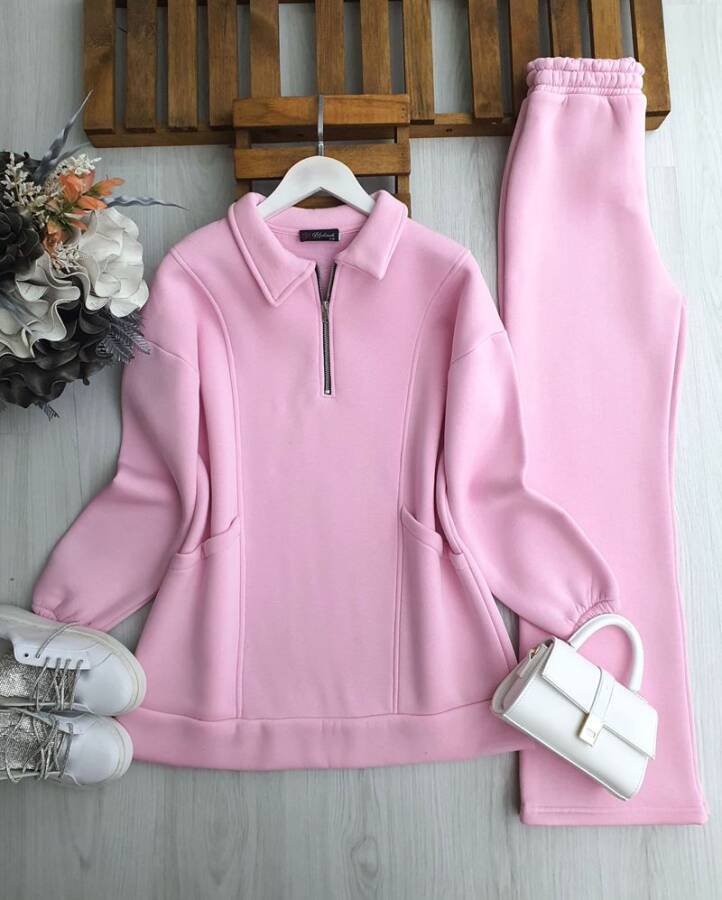DİHES YARIM FERMUAR YAKALI TORBA CEP ÜÇ İPLİK TAKIM 1679-05-PUDRA