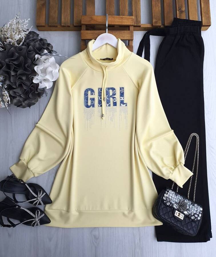 DİLES KOT YAZILI TAŞLI YAKA BAĞCIKLI TUNİK B5-5-5648-23-SARI
