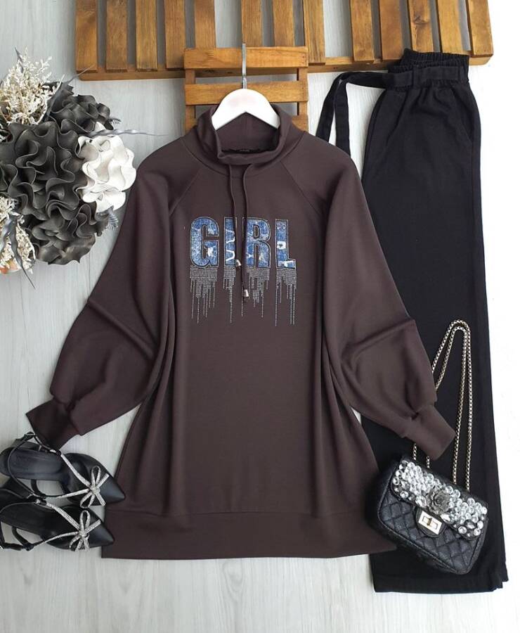 DİLES KOT YAZILI TAŞLI YAKA BAĞCIKLI TUNİK B5-5-5648-37-KAHVE