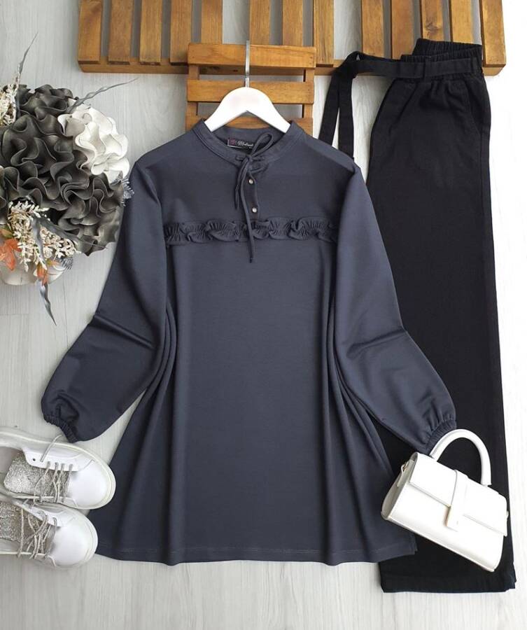 DINE YAKA BAĞCIK ÖNÜ FIRFIRLI TUNİK B4-4-5624-58-FÜME
