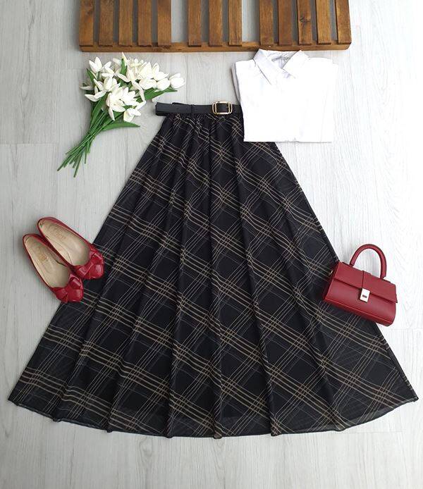 DOGN KARE DESEN DERİ KEMERLİ BELİ LASTİKLİ ASTARLI ŞİFON ETEK A6-2-6112-12-LACİVERT
