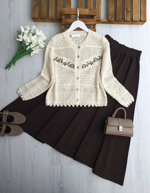 DULQ YAPRAK NAKIŞLI AJURLU DOKUMA HIRKA 8209-34-BEJ