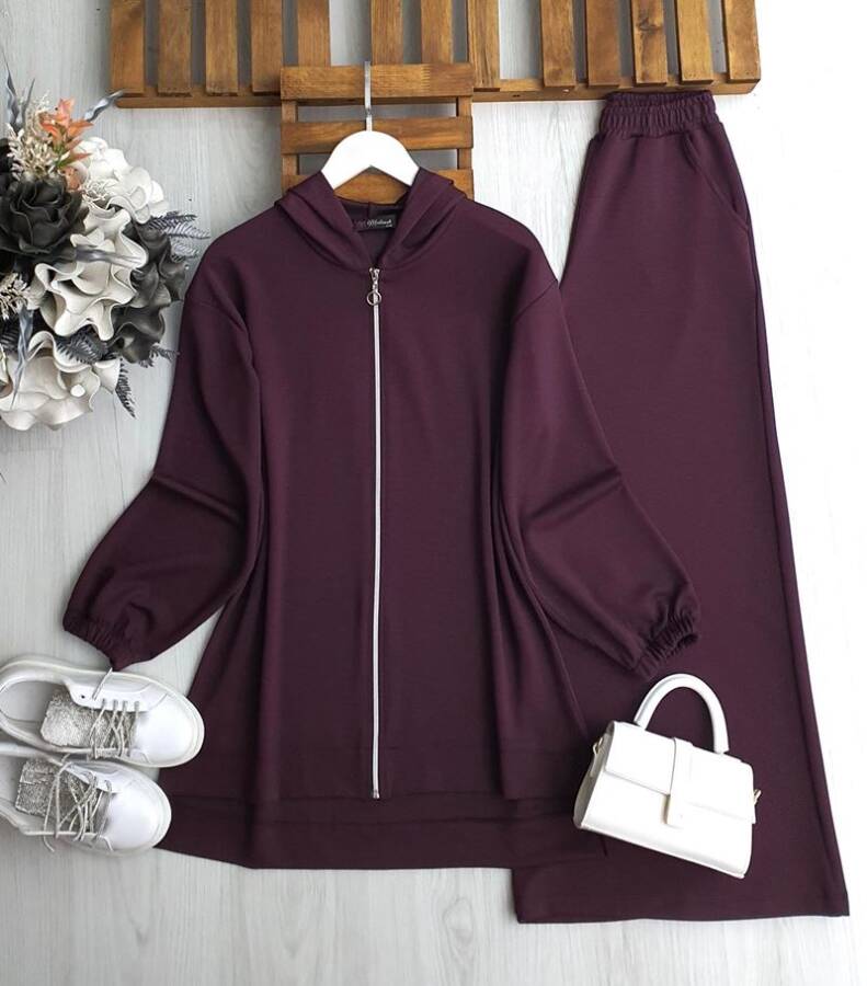 DUSE GENİŞ PAÇA PANTOLON ÖNÜ FERMUARLI İKİLİ TAKIM 1673-18- MÜRDÜM