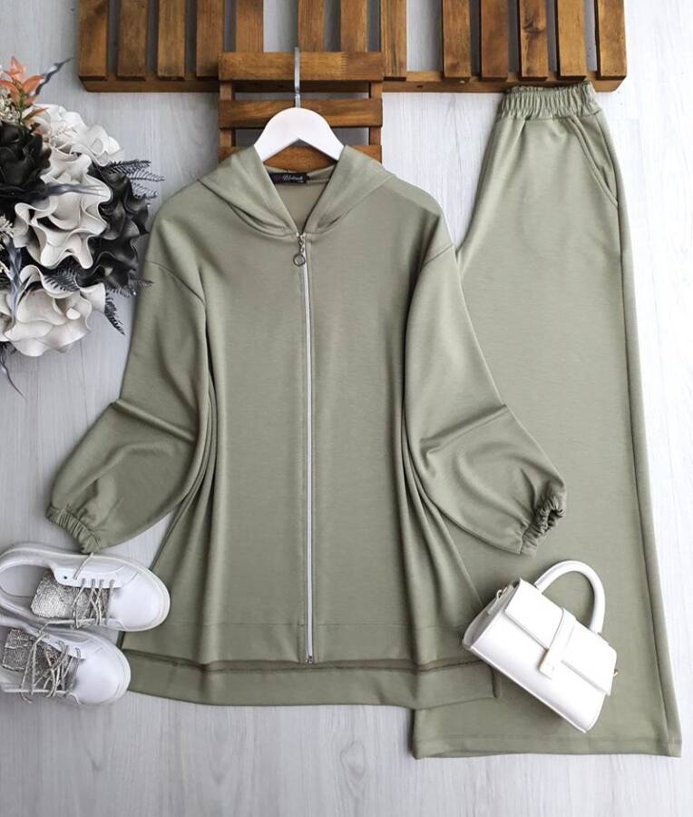 DUSE GENİŞ PAÇA PANTOLON ÖNÜ FERMUARLI İKİLİ TAKIM 1673-09-HAKİ