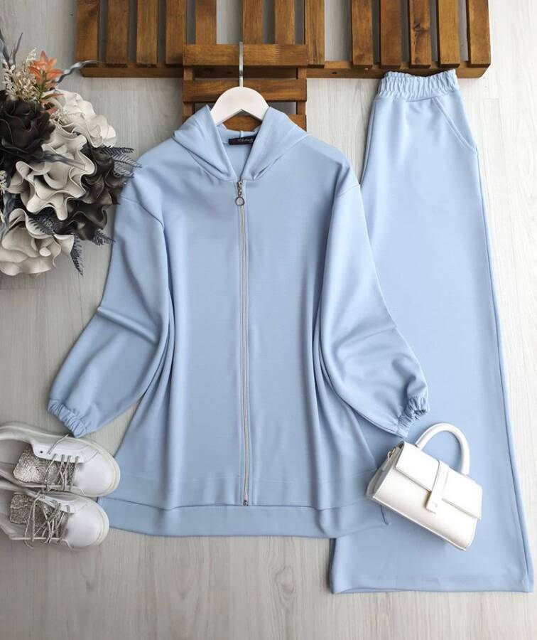 DUSE GENİŞ PAÇA PANTOLON ÖNÜ FERMUARLI İKİLİ TAKIM 1673-10-MAVİ