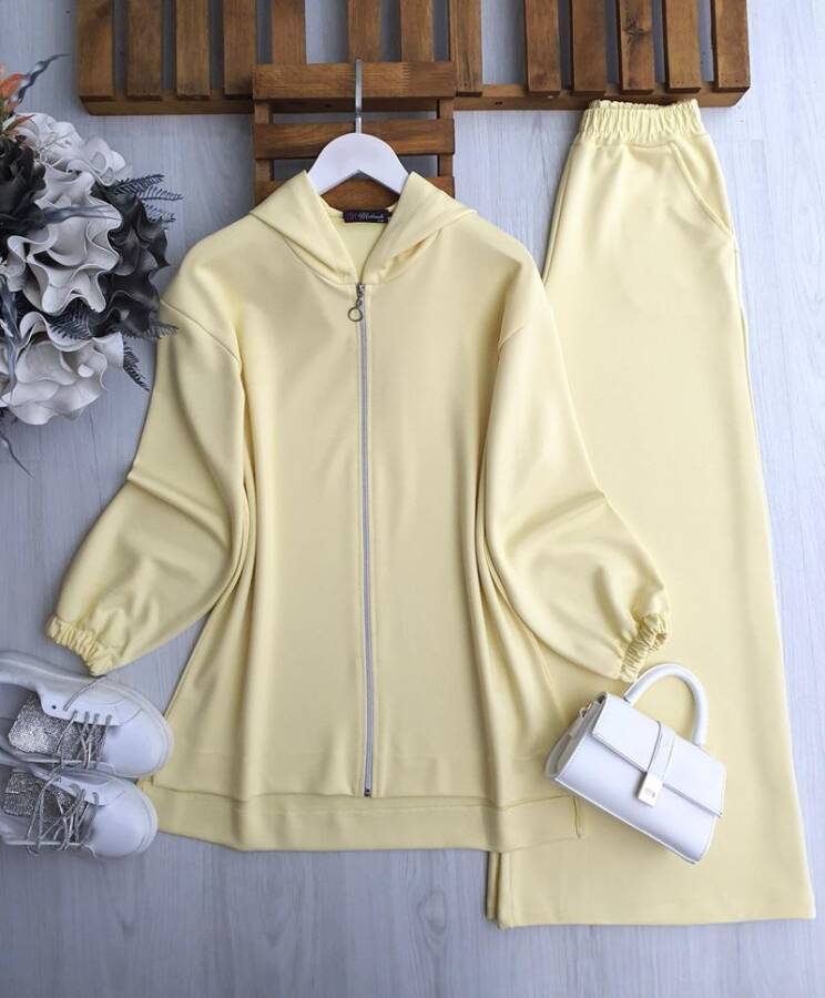 DUSE GENİŞ PAÇA PANTOLON ÖNÜ FERMUARLI İKİLİ TAKIM 1673-23-SARI