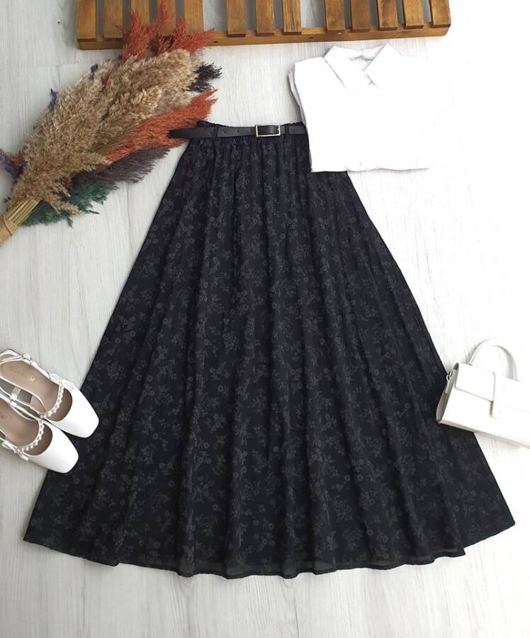 DUZLES DERİ KEMERLİ BELİ LASTİKLİ ÇİÇEK DESENLİ ASTARLI TÜL ETEK B6-4-6097-01-SİYAH