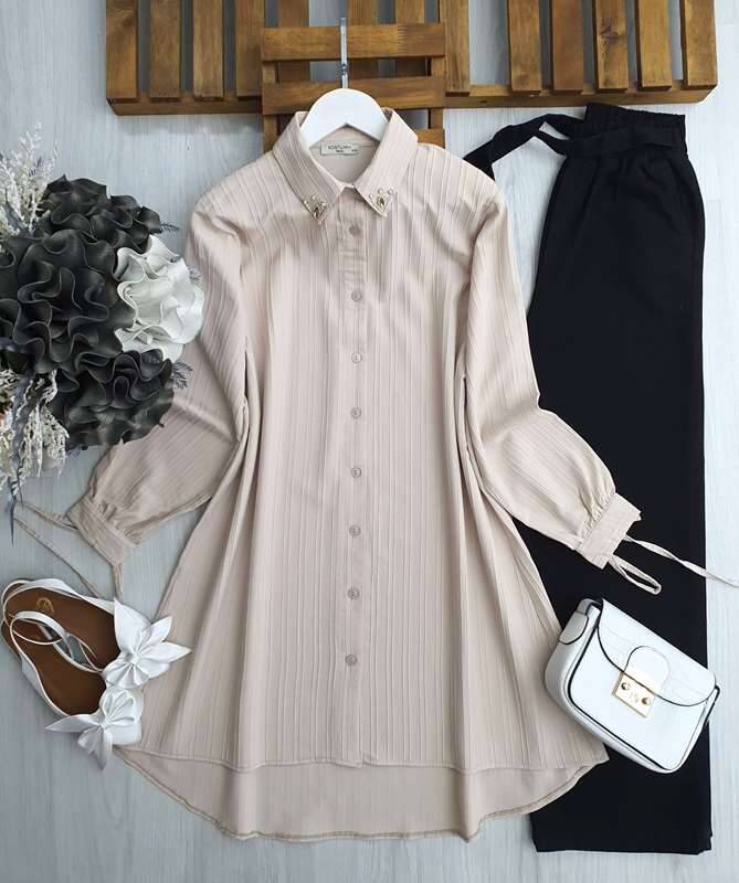 ELİW YAKA TAŞLI KOL BAĞCIKLI SALAŞ GÖMLEK TUNİK D8-5494-34-BEJ