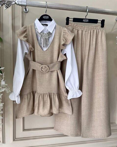 ELS KEMERLİ OMUZ FIRFIRLI KETEN ÜÇLÜ TAKIM B11-1-1524-34-BEJ