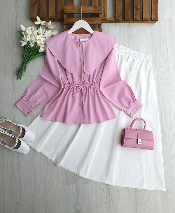 ESA BELİ LASTİKLİ VE BAĞCIKLI UZUN YAKA GÖMLEK B4-3-5699-05-PUDRA