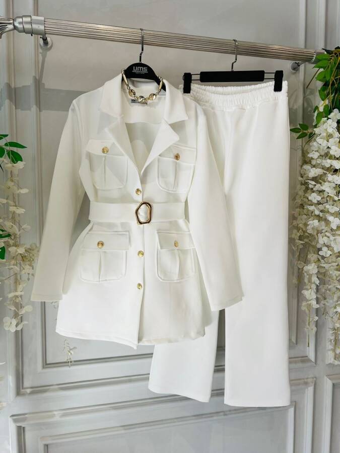 ESNO TOKALI KEMERLİ KIVRIK YAKA İKİLİ TAKIM B1-5-1665-20-BEYAZ