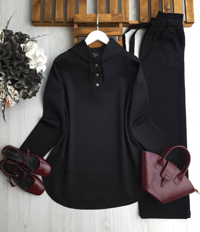 EVAY ÇITÇIT DÜĞMELİ KAPŞONLU RAHAT KALIP TUNİK A9-5-5625-01-SİYAH