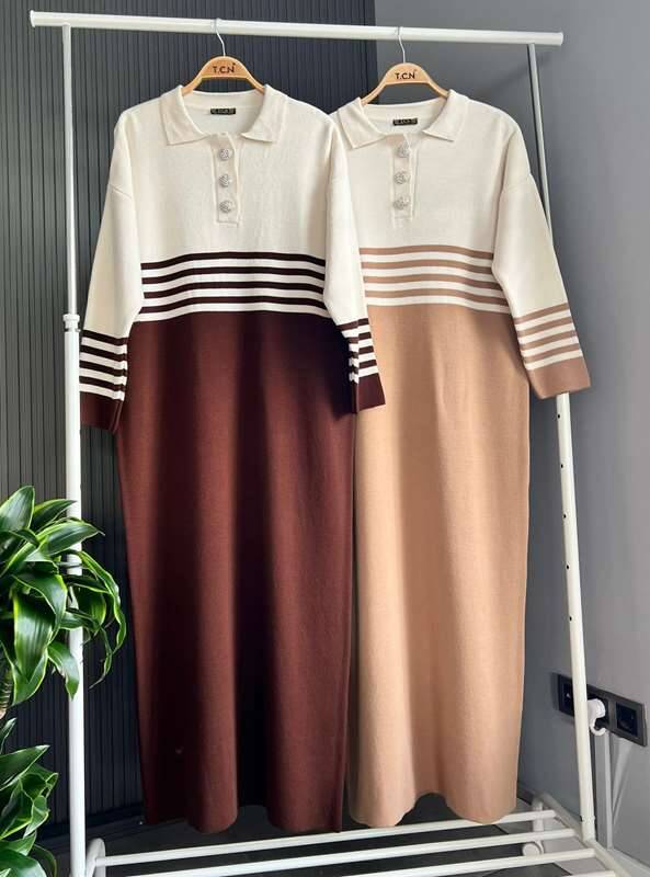EYA YAKALI DÜĞMELİ ÇİZGİLİ TRİKO ELBİSE A8-1-8116-48-BİSKÜVİ