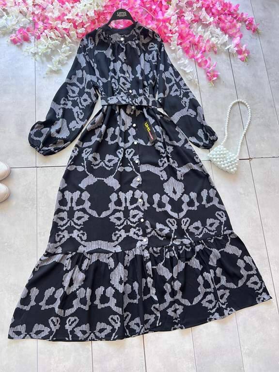 FAGİ KEMERLİ DESENLİ ÖNÜ DÜĞMELİ ELBİSE D5-2318-26-GRİ