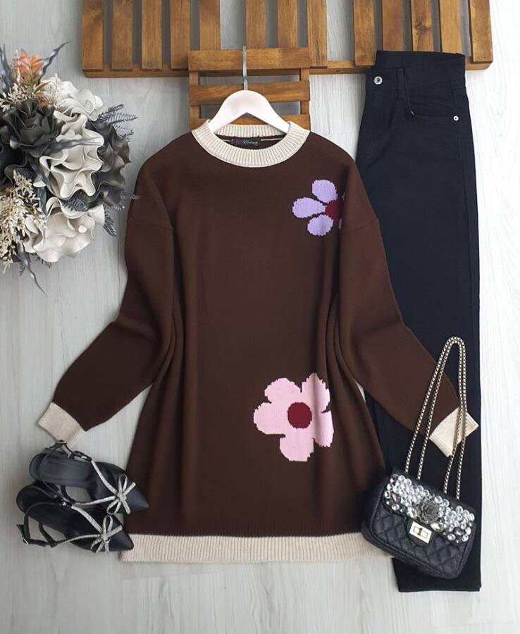 FAZG ÇİÇEK İŞLEMELİ TRİKO TUNİK B3-2-8173-37-KAHVE