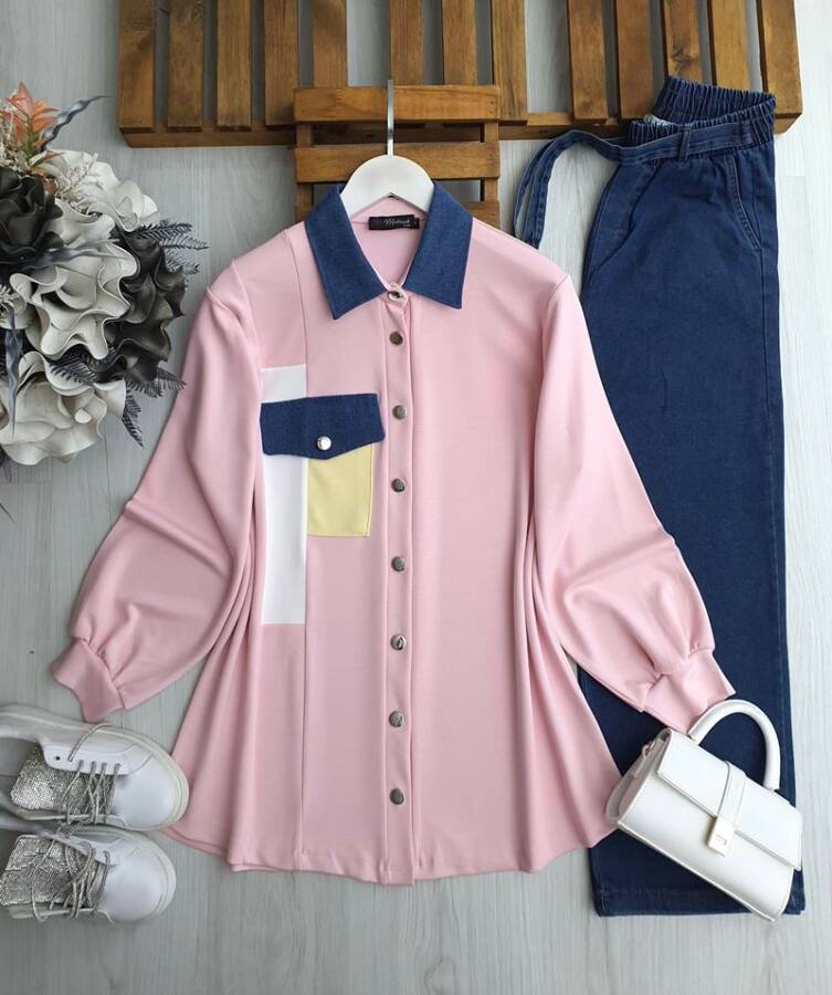 FAZLE KOT YAKA VE CEP KAPAK ÖNÜ DÜĞMELİ SALAŞ TUNİK 5632-05-PUDRA