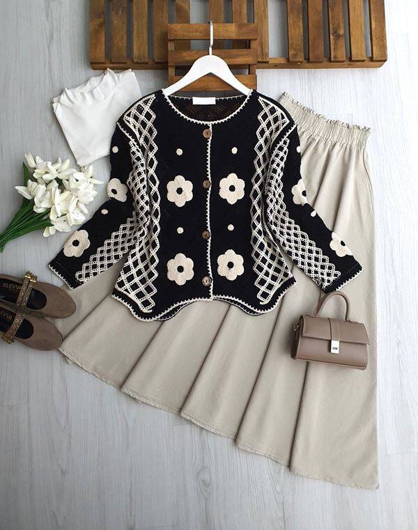 FEKD ÇİÇEK NAKIŞLI DOKUMA ÖRGÜ HIRKA 8203-01-SİYAH