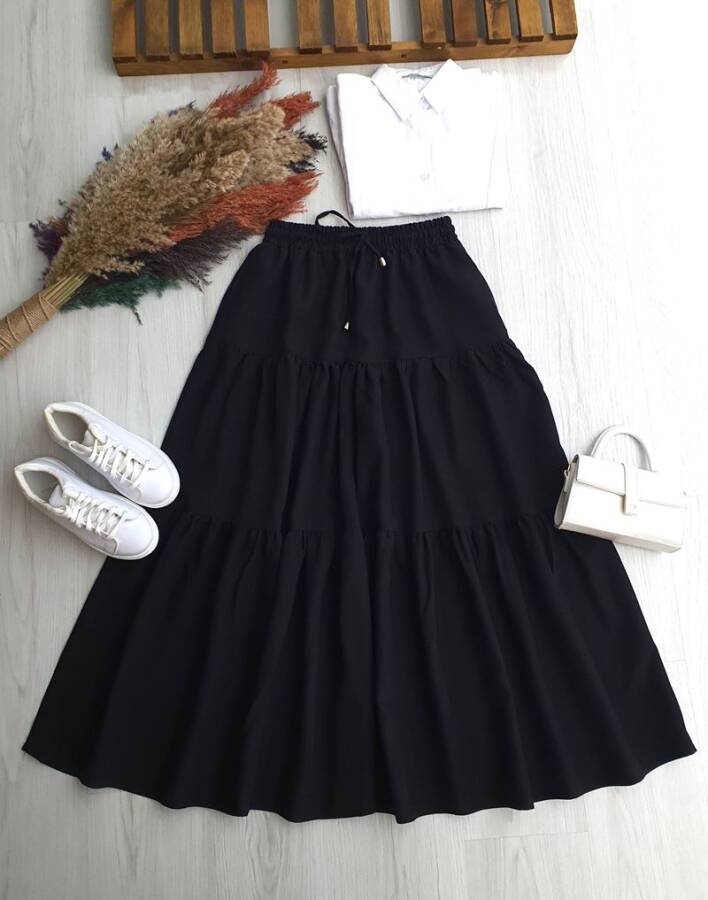 FELVA KAT KAT BELİ BAĞCIKLI VE LASTİKLİ CEPLİ ETEK 6070-01-SİYAH